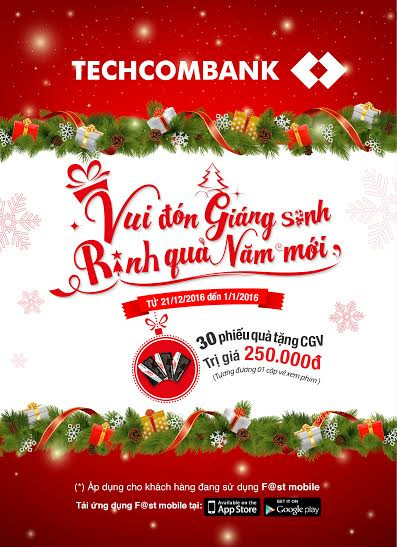 Đón mừng Giáng sinh và năm mới 2016, Ngân hàng Techcombank triển khai chương trình “Vui đón Giáng sinh, rinh quà năm mới” dành cho các khách hàng sử dụng dịch vụ F@st Mobile (Mobile banking) của Techcombank.