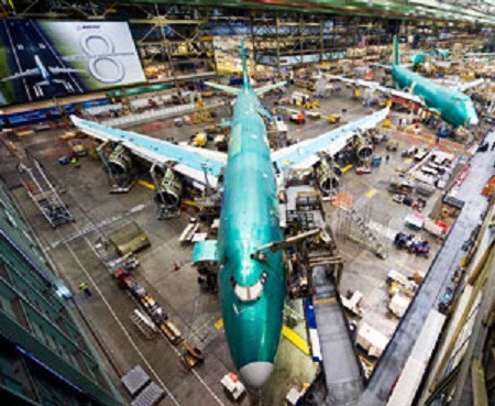 | Khung cảnh phía trước của nhà máy lắp ráp, sản xuất máy bay của Boeing tại thành phố Seattle |