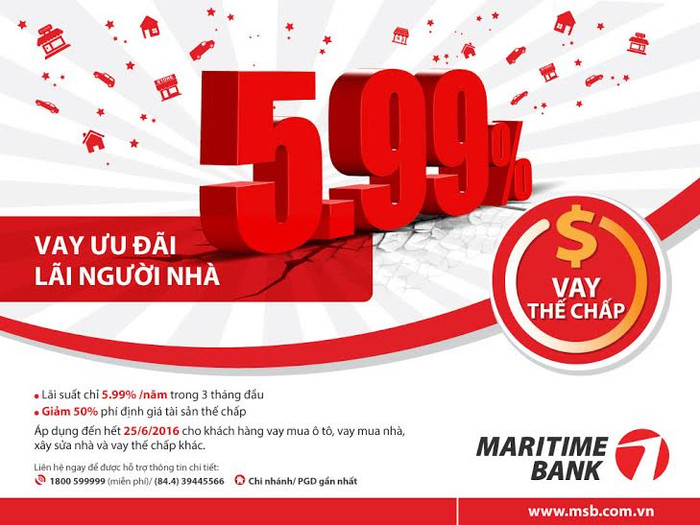 Nhằm mang đến giải pháp hỗ trợ tài chính tối ưu, đáp ứng nhu cầu vay vốn của khách hàng một cách nhanh chóng, thuận tiện từ nay tới 25/6/2016, Maritime Bank thực hiện chương trình cho vay với lãi suất cạnh tranh trên thị trường chỉ từ 5,99%/năm.