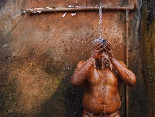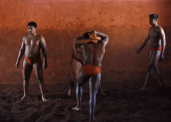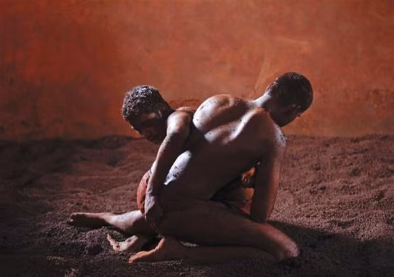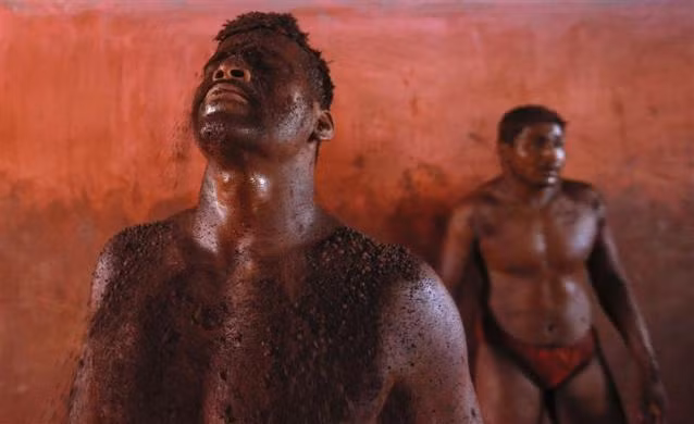 Một đô vật xoa bùn lên người để chống trơn do mồ hôi đổ ra trong quá trình luyện tập