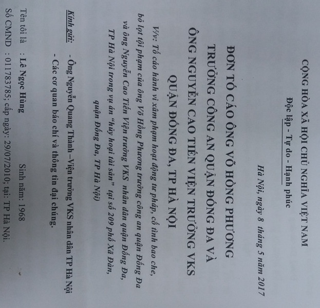 Bằng đơn tố cáo này, tôi tố cáo ông Võ Hồng Phương, Trưởng Công an quận Đống Đa và ông Nguyễn Tiến Cao, Viện trưởng Viện Kiểm sát nhân dân quận Đống Đa về hành vi bao che, cố tình bỏ lọt tội phạm, xâm phạm hoạt động tư pháp.