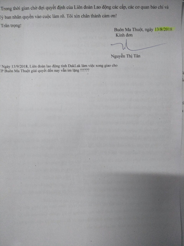 Tuy nhiên, 6 năm trở lại đây (từ tháng 9/2012 đến nay) tôi hoàn toàn mất lòng tin vào tổ chức Công đoàn vì bao lần kêu cứu không thấy một tổ chức Công đoàn nào đứng ra bảo vệ quyền lợi cho tôi (từ công đoàn cơ sở đến Liên đoàn lao động tỉnh Đắk Lăk).
