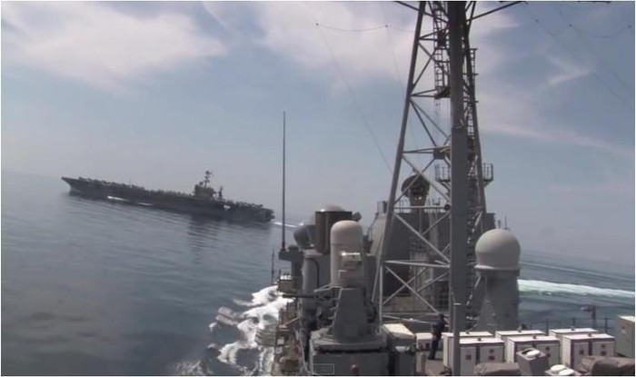 Video được quay lại từ chiến hạm USS Mobile Bay (CG 53) khi đang di chuyển cách tàu sân bay USS John C. Stennis (CVN 74) khoảng 500 mét trong lúc các chiến đấu cơ đang trình diễn màn bay VIP.