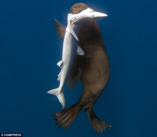 | Con hải cẩu tấn công những con cá mập nhỏ hơn kích thước của nó. |