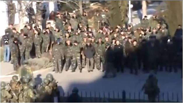 Video quay lại cho thấy một nhóm đông các quân nhân Ucraine đã vây thành một lá chắn sống, bảo vệ không cho những người biểu tình và quân nhân Nga hạ cờ Ucraine.