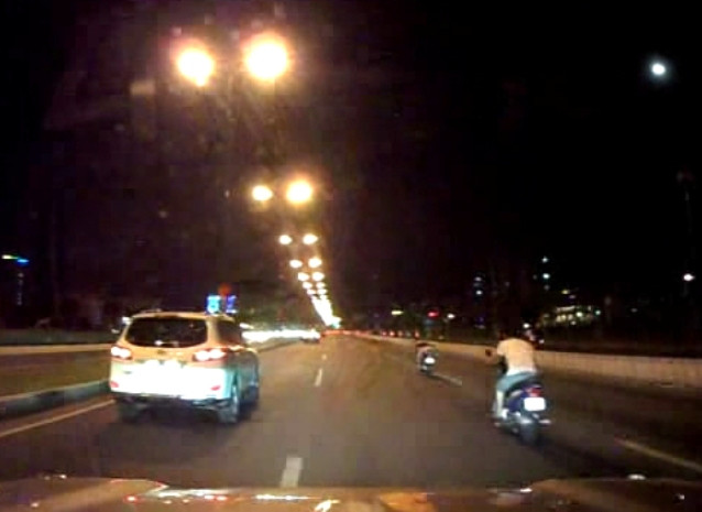 Video do camera hành trình của một xe hơi ghi lại vào 20h ngày 26/4, trên đoạn đường giữa cầu Sài Gòn và Metro An Phú, TP HCM. Tốc độ chạy xe của 2 thanh niên là trên 100km/h.