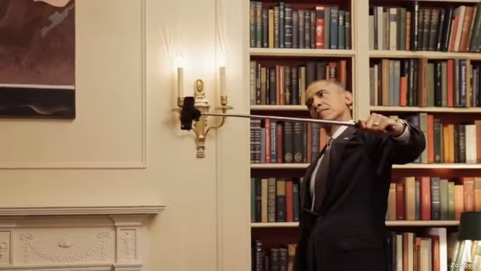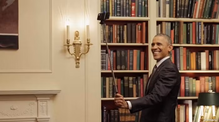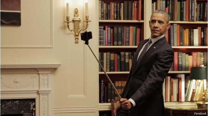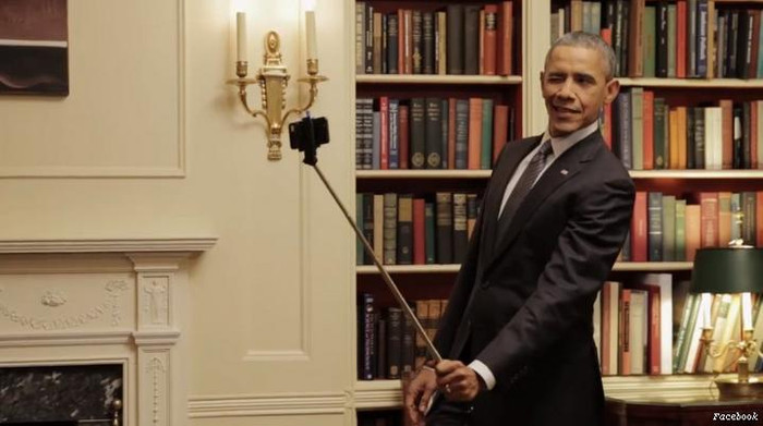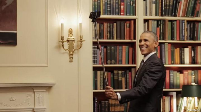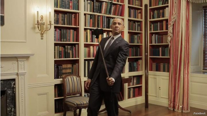 Ông Obama không ngại ngần thể hiện vẻ mặt ngốc ngếch, vẽ nguệch ngoạc hình ảnh người yêu, giả vờ chơi bóng rổ, tạo dáng chụp ảnh rất "teen" với cây gậy tự sướng như giới trẻ.