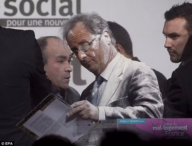 | Người ông Francois Hollande phủ đầy bột trắng sau khi bị tấn công |
