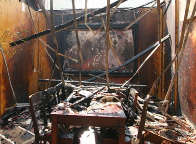 Các tấm cửa kính nhà bà Hằng gần như bị vỡ hoàn toàn, trần và vách nhà bên trong ốp bằng nhựa cùng màn cửa bị cháy rụi. Các thiết bị tivi, tủ lạnh, máy tính, nồi cơm điện, điện thoại bàn … đều bị cháy.