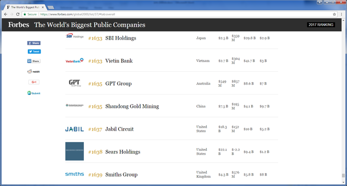 Xếp hạng của Forbes đánh giá toàn diện các doanh nghiệp dựa trên nhiều tiêu chí gồm: Doanh thu, lợi nhuận, giá trị tài sản và thị trường.