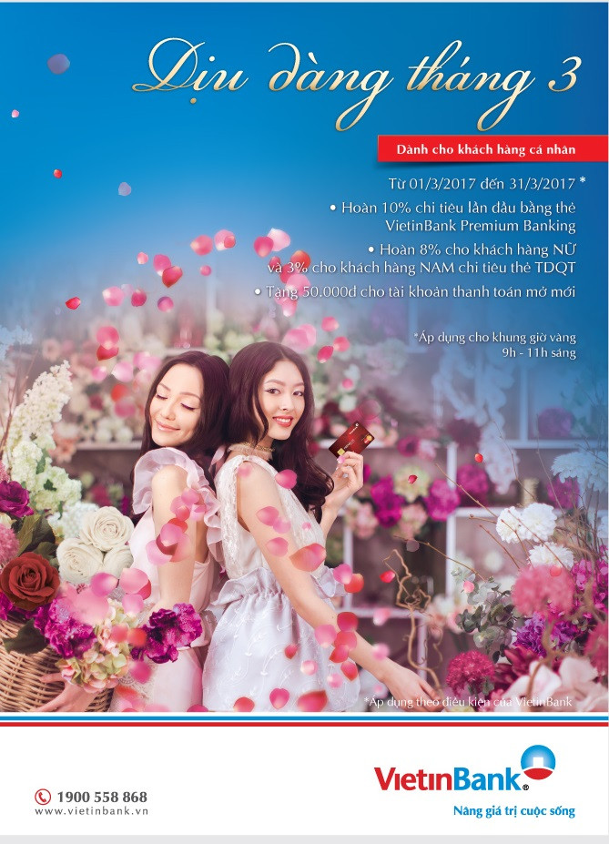 Chào mừng Ngày Quốc tế Phụ nữ 8/3, từ ngày 1/3/2017 đến hết ngày 31/3/2017, VietinBank triển khai chương trình khuyến mãi “Dịu dàng tháng 3” với những ưu đãi cùng quà tặng hấp dẫn dành tặng khách hàng, đặc biệt là khách hàng nữ.