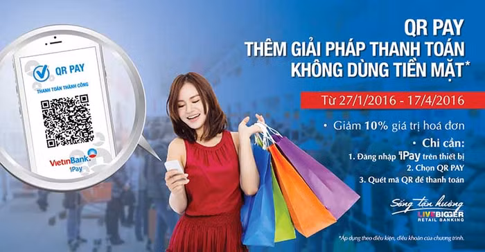 Để khuyến khích khách hàng sử dụng QR PAY, VietinBank triển khai chương trình khuyến mãi “Thanh toán bằng QR PAY nhận ngay ưu đãi”. Theo đó, VietinBank giảm 10% giá trị hóa đơn cho mọi khách hàng khi thanh toán bằng QR PAY tại các đơn vị bán hàng có chấp nhận thanh toán QR PAY.