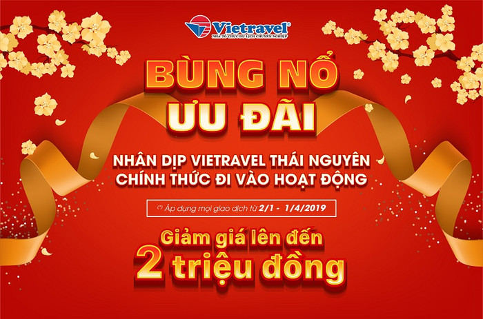 Do đó, để hướng tới phục vụ được đa dạng hơn đối tượng khách hàng cũng như thuận tiện khi liên hệ, giao dịch đối với các du khách Thái Nguyên, Vietravel đã đưa vào hoạt động Chi nhánh Thái Nguyên trước thềm Tết Nguyên đán Kỷ Hợi 2019 (số 203 Lương Ngọc Quyến, Phường Hoàng Văn Thụ, Thành phố Thái Nguyên); nhằm mang đến cho bà con tại địa phương chương trình khuyến mại sâu, giá giảm đến 02 triệu đồng liên tục trong thời gian từ ngày 02/01/2019 đến ngày 01/04/2019.