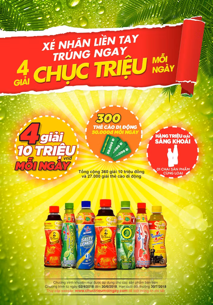 Như vậy, sau hơn một tuần triển khai, chương trình “Xé nhãn liền tay, trúng ngay 04 giải chục triệu mỗi ngày” đã có gần 40 khách hàng trúng giải thưởng 10 triệu đồng và hàng nghìn thẻ cào điện thoại mệnh giá 50 nghìn đồng và chai sản phẩm.