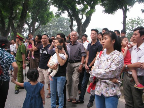 | Rất đông các em nhỏ cũng theo cha mẹ cùng tới viếng thăm Bác. |