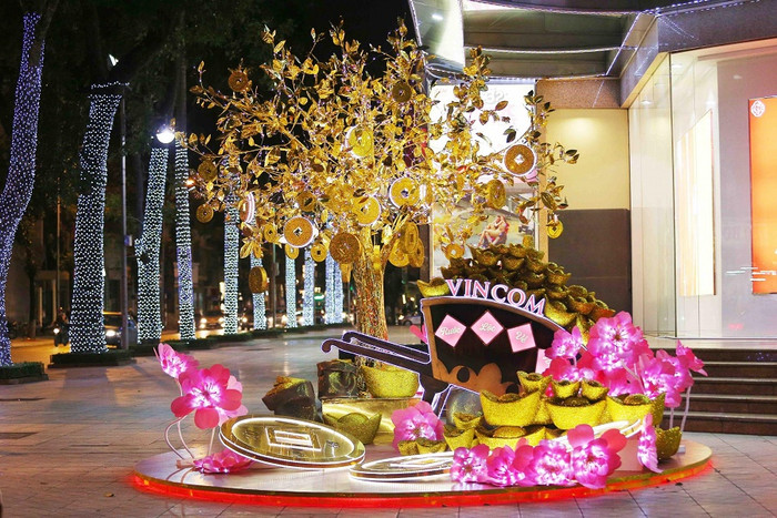 Vincom Center Bà Triệu và Vincom Center Đồng Khởi lại thu hút mọi người với ‘Cây Tài Lộc’ và ‘Xe Rước Lộc’, được các nghệ nhân tạo hình lộng lẫy từ các đồng tiền vàng khổng lồ.