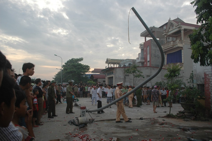 Tại hiện trường, thi thể người phụ nữ bay lên mái nhà cao khoảng 4 mét, cách vị trí tai nạn khoảng 20 mét, tử vong trên máy nhà. Còn người đàn ông bị cuốn theo xe ô tô tử vong, cách xe lật khoảng 3m. Trong khi đó, cháu trai 6 tuổi bay vào cửa nhà dân cách vị trí tai nạn tới hơn 20 mét.