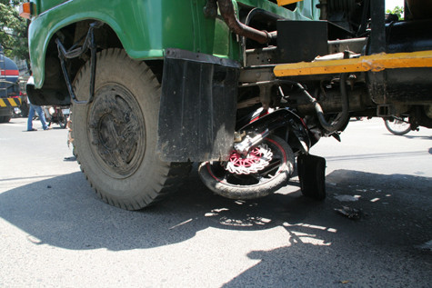 Cú va chạm khiến xe taxi dính má vào dải phân cách, chồm lên còn xe tải thì nuốt gọn xe máy và 2 nam thanh niên trên xe, kéo đi một đoạn dài. Có nhân chứng nhìn thấy một nạn nhân đánh đu dưới gầm xe.