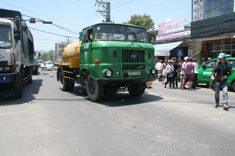 Xe tải (xe hút hầm vệ sinh) vượt đèn đỏ “nuốt” gọn xe máy và 2 nam thanh niên đang dừng xe trước đèn đỏ.
