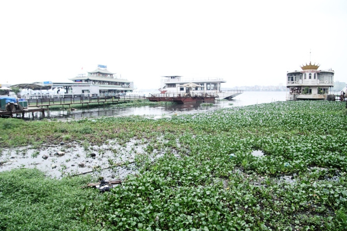 | Một con tàu khác cũng đang "nằm đắp chiếu", xung quanh là bèo tây vây kín. |