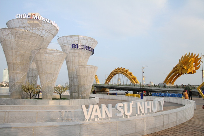 | ...và cạnh cầu Rồng (đoạn đối diện Trung tâm Truyền hình Việt Nam tại Đà Nẵng), khu ánh sáng với khối kết cấu gồm 5 tháp ly lớn và 3 vòng tròn đồng tâm sẽ là sân khấu chính cho các hoạt động mừng Xuân Ất Mùi 2015. |