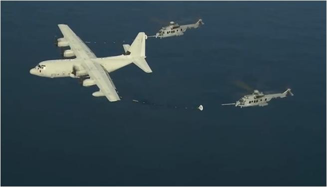 Máy bay tiếp dầu trên không KC-130J của Không quân Italy đã thực hiện xuất sắc nhiệm vụ bơm nhiên liệu bổ sung cho hai chiếc trực thăng cánh quạt hặng nặng cùng lúc.