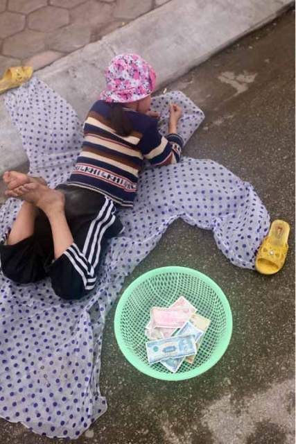 | Em bé ngây thơ chưa hiểu gì về đồng tiền vẫn bị bắt ép ngồi vỉa hè xin tiền |