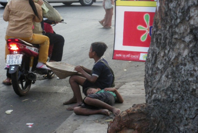 | Trẻ ăn xin nằm hẳn giữa đường. (Ảnh Việt Báo) |