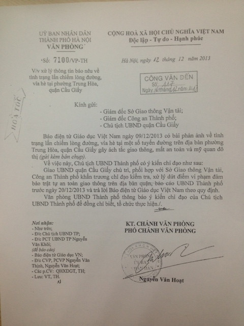Ngày 12/12/2013, Văn Phòng UBND TP Hà Nội đã có công văn số 7100/VP-PH thông báo ý kiến chỉ đạo của Chủ tịch UBND TP Hà Nội Nguyễn Thế Thảo giao cho quận Cầu Giấy chủ trì phối hợp với Sở Giao thông Vận tải, Công an TP Hà Nội khẩn trưởng chỉ đạo, kiểm tra, xử lý dứt điểm vi phạm đảm bảo trật tự an toàn giao thông trên địa bàn quận, báo cáo UBND TP trước ngày 20/12 và trả lời Báo điện tử Giáo dục Việt Nam theo quy định.