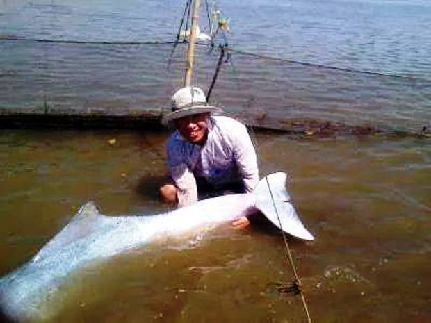 Anh Bằng cho biết, con cá heo trắng này dài khoảng 2,5 mét, nặng chừng 4 tạ. Còn về số tuổi cá heo, anh Bằng đoán “có thể mình phải gọi bằng ông”.