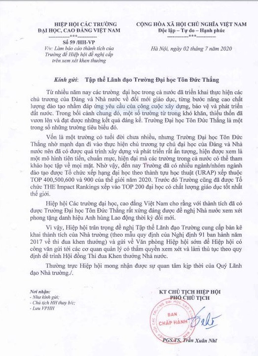 Hơn nữa, ngay từ ngày 02/07/2020, Hiệp hội đã có công văn số 59/HH-VP gửi Trường Đại học Tôn Đức Thắng về việc làm báo cáo thành tích của Trường để Hiệp hội đề nghị cấp trên khen thưởng: