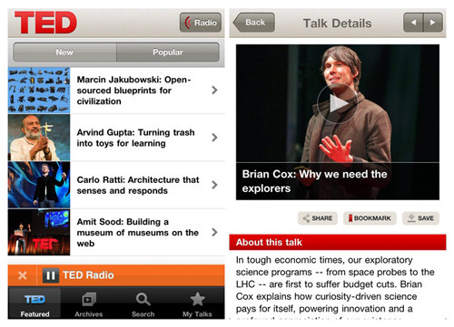 TED cũng là một ứng dụng di động khá hay cung cấp cho người sử dụng rất nhiều kiến thức trên nhiều lĩnh vực khác nhau. Bạn có thể đọc, xem hoặc nghe những đoạn video hay bài giảng về giáo dục. Tuy rằng số lượng các bài giảng còn khá khiêm tốn ở mức 900 bài giảng nhưng TED theo phương châm "lấy chất bù lượng", bạn có thể thấy điều này rõ ràng hơn khi tự mình dùng và cảm nhận TED. Tất cả những nội dung có trên máy chủ của TED đều có thể được tải về một cách dễ dàng để xem offline.