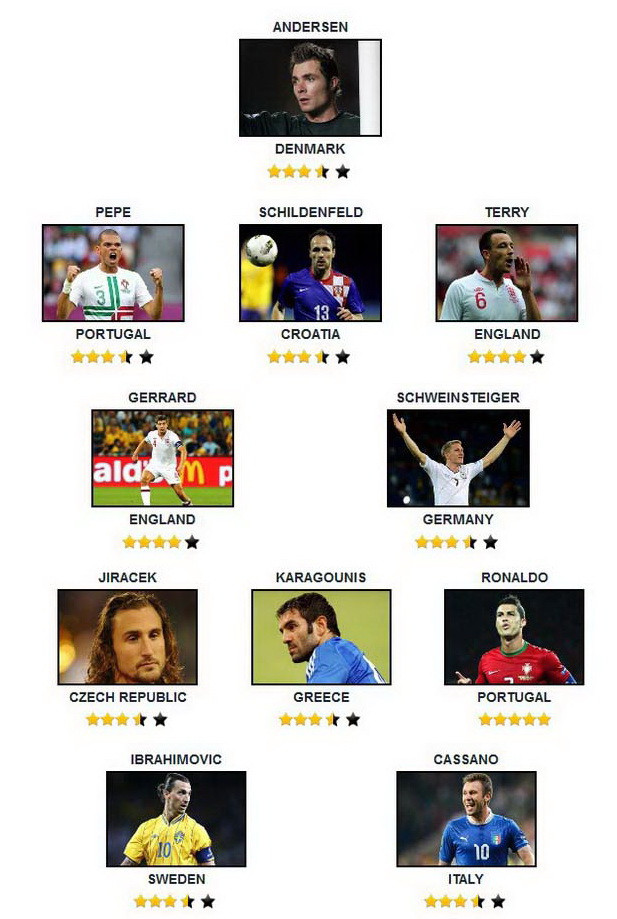 Bastian Schweinsteiger xứng đáng với biệt danh "ông hoàng khu trung tuyến" khi một lần nữa góp mặt trong đội hình tiêu biểu của EURO 2012. Cho dù không ghi bàn và kiến tạo trong trận thắng Đan Mạch nhưng với khả năng cầm nhịp và điều tiết trận đấu, tiền vệ Bayern đã chấm dứt tham vọng bay cao của những chú lính chì. Trong khi đó, Steven Gerrard đã có một trận đấu tuyệt vời trước chủ nhà Ukraine.