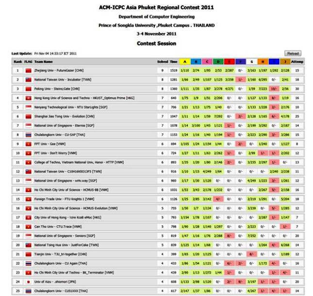 Kết quả chung cuộc, ngôi vô địch Kì thi ACM/ICPC khu vực châu Á tại Thái Lan năm nay đã thuộc về đội tuyển Trường ĐH Zhejiang (Trung Quốc).