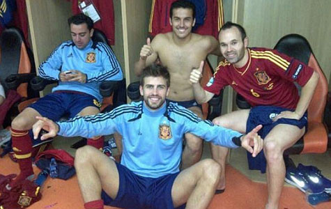 “Đội bóng thật vĩ đại! Còn gì hạnh phúc hơn. Chúng ta đã đi đến trận đấu cuối cùng. Xin cảm ơn tất cả”, Iniesta viết trên Twitter của mình kèm bức ảnh 4 cầu thủ Barca, trong đó Pedro chỉ mặc mỗi quần lót.