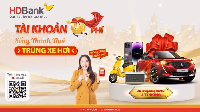 Tiếp tục mang đến cho khách hàng những ưu đãi tuyệt vời, khách hàng khi mở mới tài khoản thanh toán của HDBank sẽ được tận hưởng tiện ích 0 phí vượt trội, còn có cơ hội bốc thăm trúng thưởng các giải thưởng hấp dẫn từ HDBank với tổng giải thưởng hơn 2 tỷ đồng, gồm: 01 giải Đặc biệt là Xe hơi Peugeot 2008 phiên bản Active sản xuất năm 2022, 01 giải Nhất xe VESPA Sprint 125 I- Get ABS LED-S, 02 giải Nhì iPhone 14 Pro max 128GB, 10 giải Ba là Loa Marshall Stanmore II và 40 giải Khuyến khích là Sổ tiết kiệm online kỳ hạn 1 tháng hạn mức 2 triệu đồng.