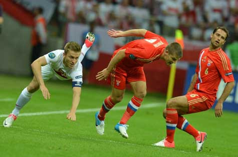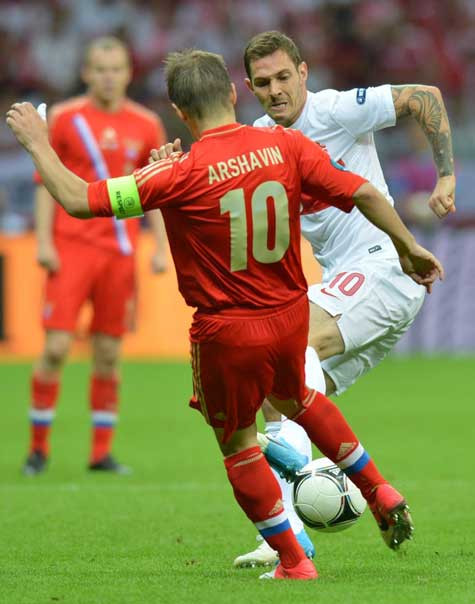 35' Nhận thấy sự nguy hiểm của Arshavin, Smuda ngay lập tức dồn 6 người về bao quanh khu cấm địa và cắt 2 người bám sát tiền vệ của Zenit. Đá phạt cho Nga sau pha xoạc bóng của Wasilewski với Zyryanov.