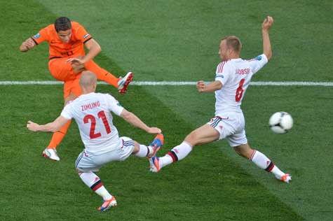 50' Một quả chọc khe rất chính xác của Sniejder đặt Van Persie vào thế trống trải ở chếch bên trái khu 16m50 Đan Mạch. Ở bước tiếp theo, Van Persie loạng choạng mất thăng bằng và mất luôn bóng.