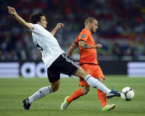 - Một hiệp đấu mà Hà Lan đã khởi đầu tốt và có cơ hội ghi bàn cho Van Persie, nhưng kể từ sau bàn thắng của Gomez ở phút 24, họ đã không thể đứng dậy. Mannschaft khống chế tuyến giữa một cách rất chắc chắn cộng thêm sức ép dồn liên tục vào vị trí hậu vệ trái bên phía Hà Lan của Jetro Willems. Mark Van Bommel và Nigel De Jong cũng mắc sai lầm trong bàn thua đầu tiên khi để lộ khoảng trống cho Schweinsteiger chuyền bóng.