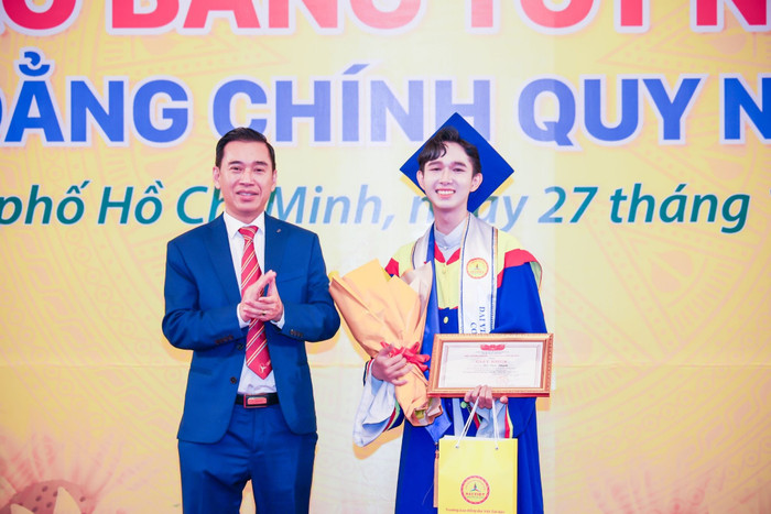 Tiến sĩ Lê Lâm - Chủ tịch Hội đồng Quản trị Hệ thống Giáo dục Đại Việt, Hiệu trưởng Trường Cao đẳng Đại Việt Sài Gòn trao bằng tốt nghiệp cho các tân khoa.