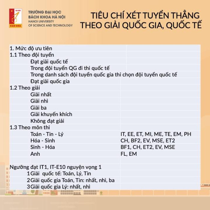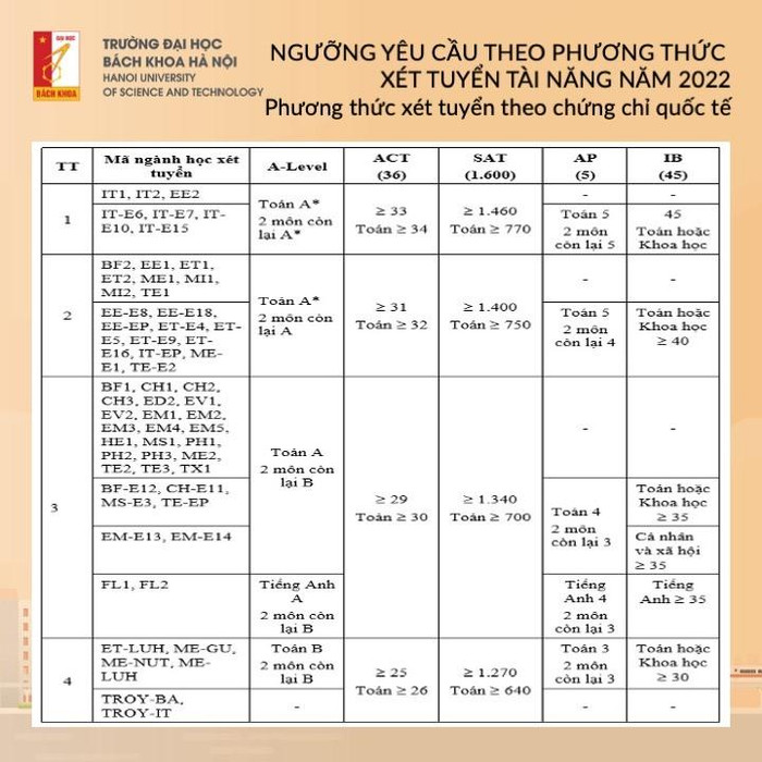 Năm 2022, Trường Đại học Bách khoa Hà Nội cho phép thí sinh đăng ký xét tuyển tài năng theo 3 hình thức: Xét tuyển thẳng theo kết quả kỳ thi học sinh giỏi quốc gia/quốc tế; xét tuyển theo chứng chỉ quốc tế và xét tuyển theo hồ sơ năng lực kết hợp với phỏng vấn.