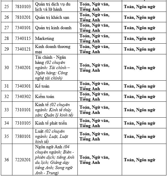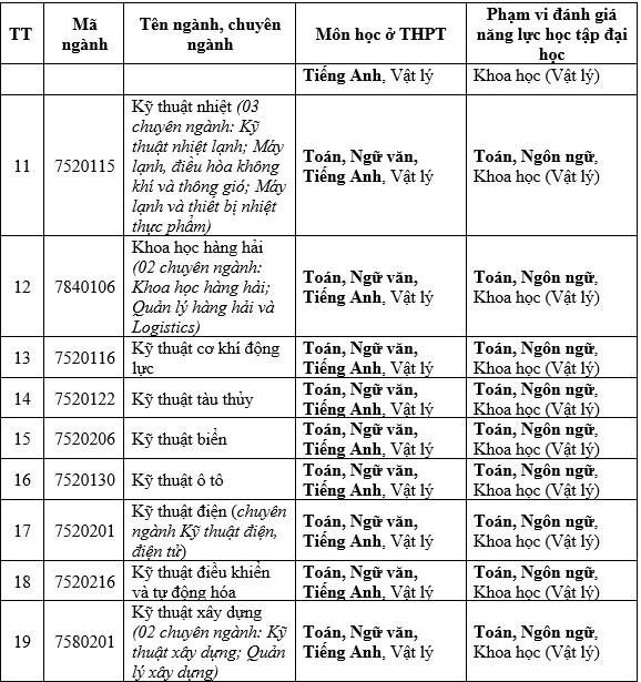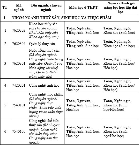 Danh mục các môn học ở trung học phổ thông và phạm vi đánh giá năng lực học tập đại học từng ngành, chuyên ngành của Trường Đại học Nha Trang cho năm tuyển sinh 2025 như sau: