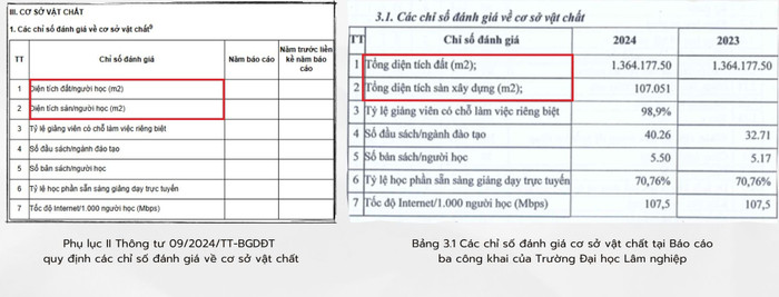 Ngoài ra, Phụ lục II ban hành kèm theo Thông tư số 09/2024/TT-BGDĐT quy định các chỉ số đánh giá về cơ sở vật chất, yêu cầu các cơ sở giáo dục đại học công khai diện tích đất/người học và diện tích sàn/người học. Tuy nhiên, theo Báo cáo ba công khai của Trường Đại học Lâm nghiệp, nhà trường mới công khai tổng diện tích đất và tổng diện tích sàn xây dựng, chưa cập nhật đúng các chỉ số theo yêu cầu của Thông tư 09/2024/TT-BGDĐT.