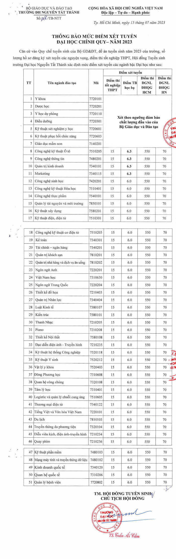 Theo mức điểm mà Trường Đại học Nguyễn Tất Thành công bố, điểm sàn các ngành học trung bình từ 15 điểm theo phương thức xét tuyển điểm thi tốt nghiệp trung học phổ thông 2023.