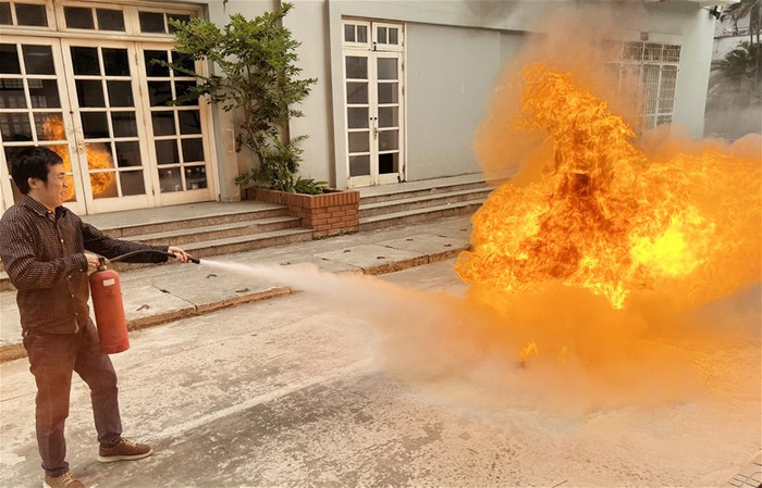 | Viên chức, người lao động và sinh viên Trường Đại học Điện lực thực hành bình chữa cháy tại chỗ. |