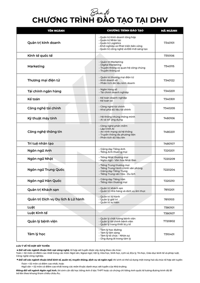 Năm 2026, DHV triển khai đào tạo 20 ngành học với hơn 50 chương trình đào tạo, trải rộng trên nhiều lĩnh vực như kinh tế, quản trị, tài chính, luật, tâm lý học, kỹ thuật - công nghệ, ngôn ngữ, du lịch - dịch vụ và truyền thông.