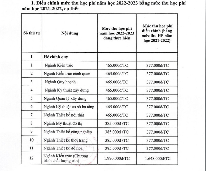 Trước đó, ngày 22/12/2022, Trường Đại học Kiến trúc Thành phố Hồ Chí Minh đã ra Thông báo số 1148/TB-ĐHKT về việc điều chỉnh mức thu học phí năm học 2022-2023.