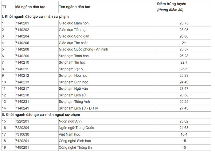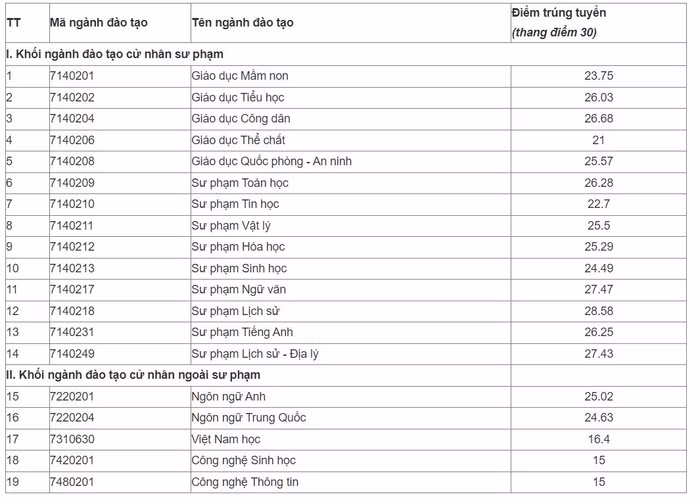 Theo đó, nhóm ngành có điểm chuẩn cao gồm Sư phạm Ngữ văn, Sư phạm Lịch sử Sư phạm Toán học, Sư phạm Tiếng Anh, Giáo dục Tiểu học, Giáo dục công dân.