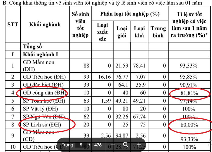 Cũng theo tìm hiểu của phóng viên, theo báo cáo 3 công khai năm học 2022 - 2023, tỷ lệ sinh viên có việc làm sau 1 năm của ngành Giáo dục công dân có xu hướng giảm, tỷ lệ này là 81,81 %.