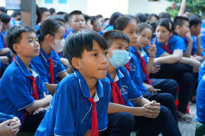 | Học sinh chăm chú lắng nghe và trả lời các câu hỏi của chuyên viên Thanh Nhàn (Ảnh: Phạm Linh) |